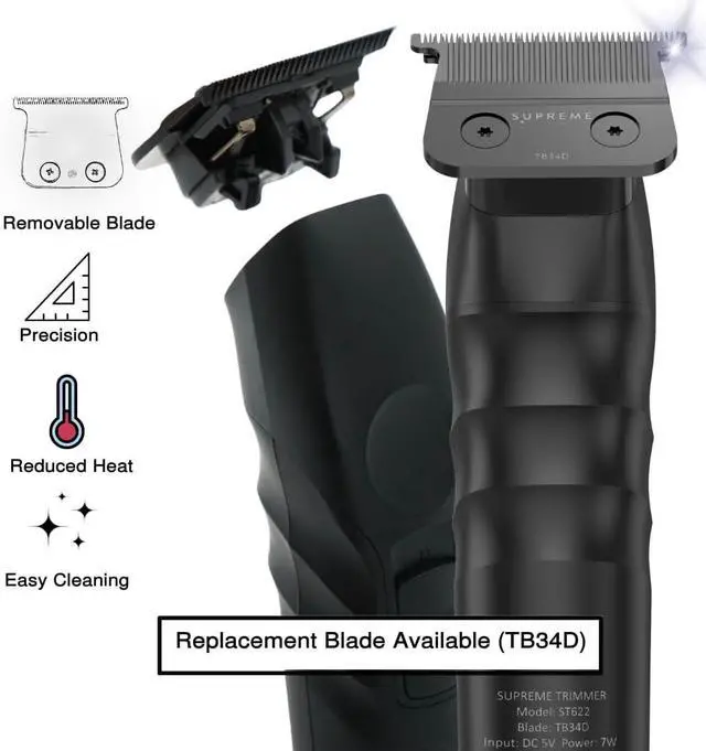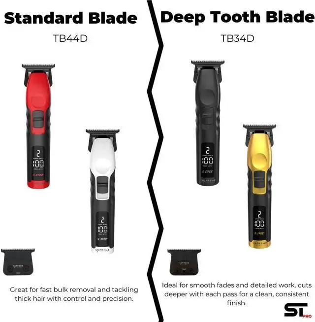 Clean Detachable T-Blade: The 2SPEE Trimmer features a detachable T-Blade system for effortless cleaning and easy blade changes. Black & Gold models use a Deep Tooth Blade (TB34D), while Red & White models use a Standard Tooth Blade (TB44D). Replacement blades available separately.