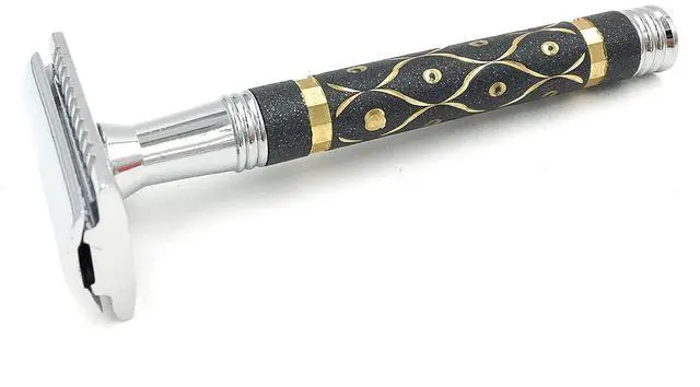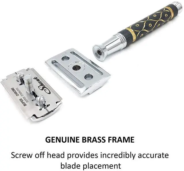 BRASS FRAME WITH TEXTURED GRIP Built with a solid brass core and a unique sandstone-textured handle for excellent gripeven when wet. The chrome-plated finish resists corrosion while offering a premium, barbershop-quality appearance that stands out on any grooming shelf.