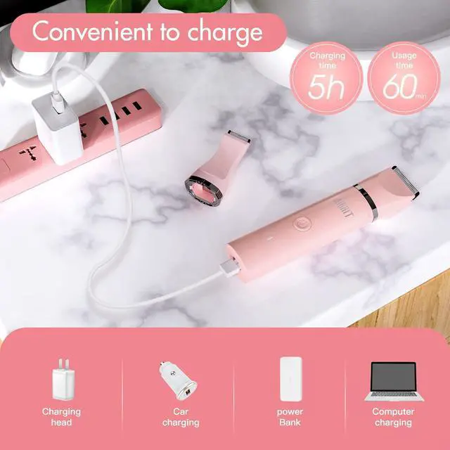 USB Rechargeable & PowerElectric bikini trimmer can be fully charged in just 5 hours with USB convenience charging, available for up to 60 minutes cordless use under the highest speed mode. Lightweight and portable. Convenient for travel.