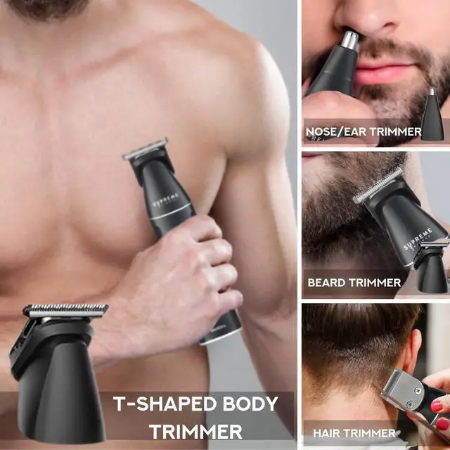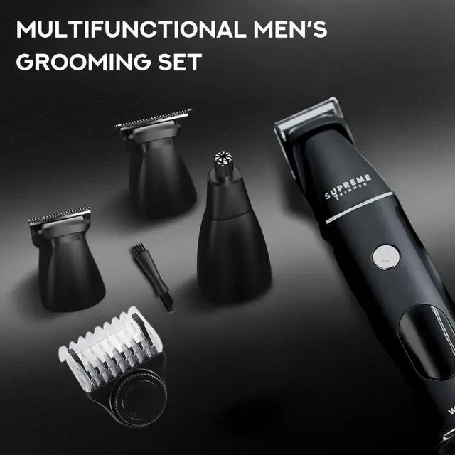All-in-One Grooming Kit for Men Supreme Trimmer SMG3030 includes 3 interchangeable heads: Wide T-Blade for full hair & beard trimming, U-Blade for sharp lines & detailing, and Nose/Ear attachment for safe precision grooming. Perfect from head to toe care.
