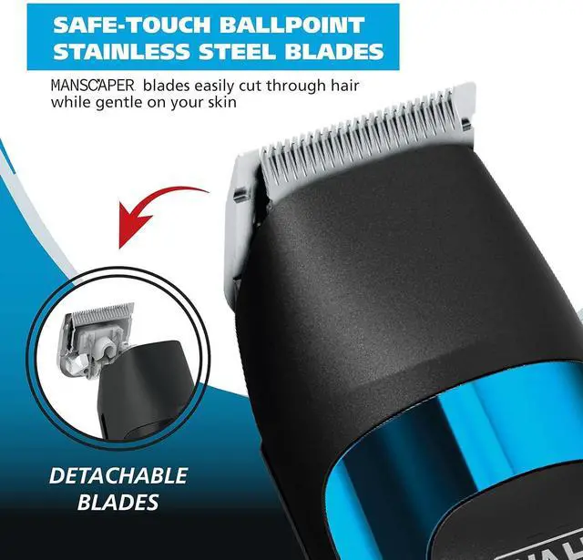 Safe-Touch Detachable Blades - Our Safetouch ballpoint stainless steel blades allow Manscaper to easily cut through your hair while remaining gentle on your skin; our blades are also detachable for hygienic grooming