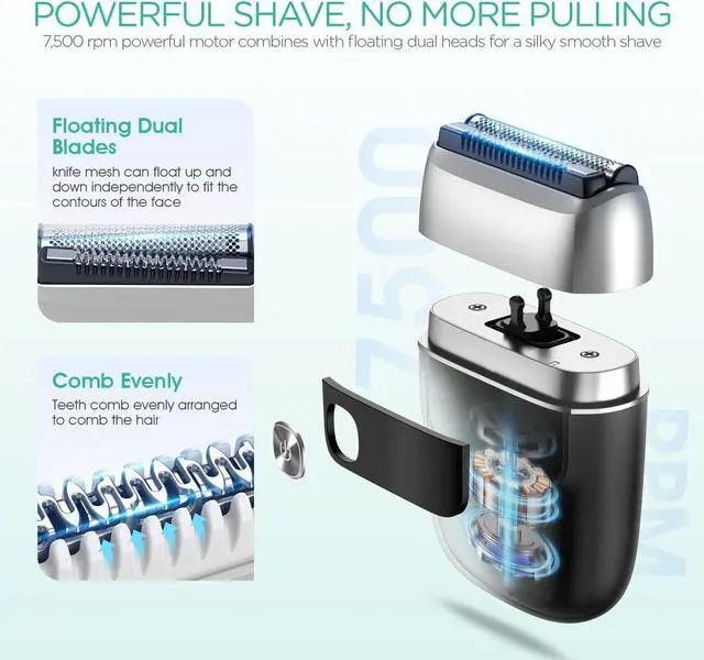 Strong power: The electric razor with rechargeable battery, which can rotate at 7500 RPM, provides strong power and with internal sharp blades to achieve efficient shaving. Helping you to easily and comfortably trim hair on your face, neck, chin, and even head. So that you can enjoy every moment of shaving!