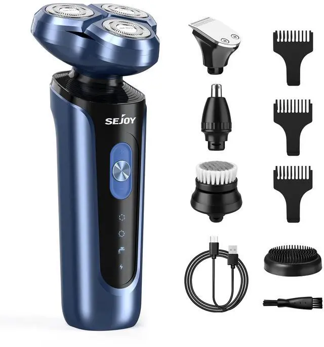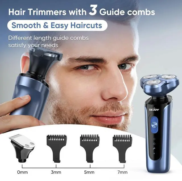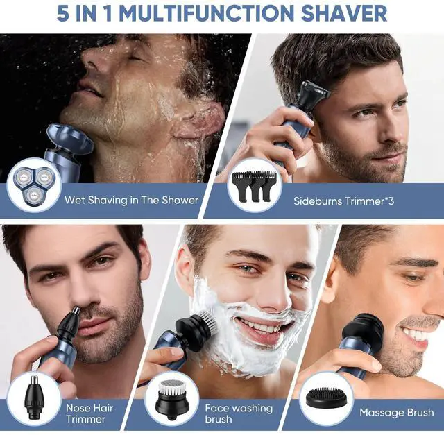 5-IN-1 ROTARY SHAVER: An extremely versatile men's shaver includes four interchangeable heads that not only shaves your beard but also allows you to trim away sideburns, hairs (3mm,5mm,7mm) and nose hairs. In addition, features a facial cleaning brush and massage brush for deep skin cleansing. You can easily cut your hair to your preferred length. For all your hair trim and facial needs.