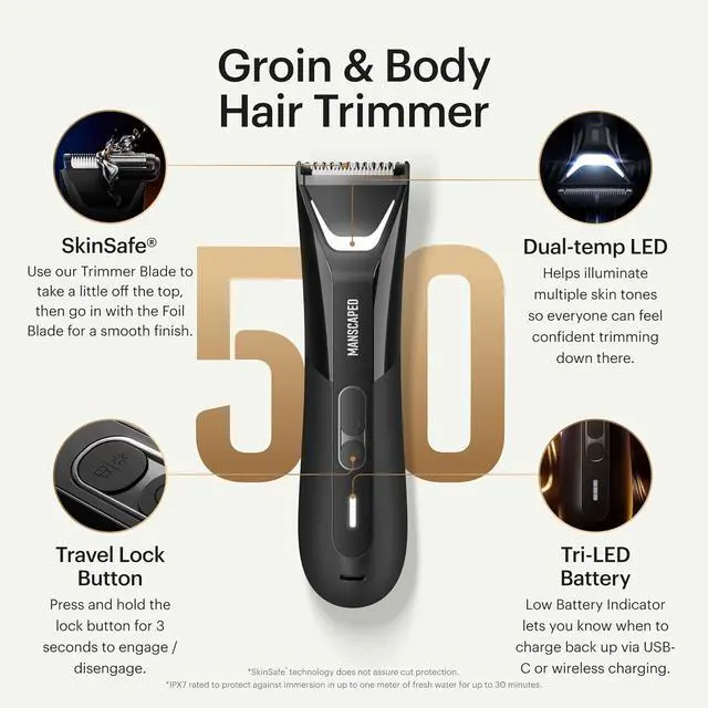 LIGHT YOUR SPOT: Grooming below the waist shouldnt be a guessing game. Dual-temp LEDs better illuminate multiple skin tones so everyone can feel confident trimming down there. Spend more time trimming, less time charging with a 700mAh Li-ion battery that holds a charge for up to 60 minutes. A travel lock helps reduce accidental powering on of the device, so your trimmer is fully juiced when you arrive at your destination. Press and hold the lock button for 5 seconds to engage / disengage.