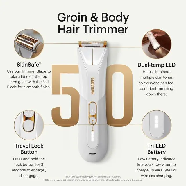 LIGHT YOUR SPOT: Grooming below the waist shouldnt be a guessing game. Dual-temp LEDs better illuminate multiple skin tones so everyone can feel confident trimming down there. Spend more time trimming, less time charging with a 700mAh Li-ion battery that holds a charge for up to 60 minutes. A travel lock helps reduce accidental powering on of the device, so your trimmer is fully juiced when you arrive at your destination. Press and hold the lock button for 5 seconds to engage / disengage.