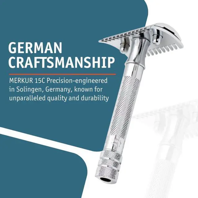 OPEN COMB DESIGN: The MERKUR 15C features an open comb design, standard handle, and 3-piece construction for a close, efficient shave. Its blade exposure is perfect for coarse hair, while the design ensures easy cleaning and enhanced durability.