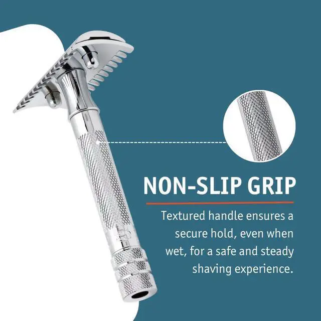 NO PLASTIC DESIGN: With a handle made of high-quality brass and a chrome finish, this double edge razor ensures long-lasting performance. It' s heavier than aluminum and plastic razors, delivering a smoother shave every time.