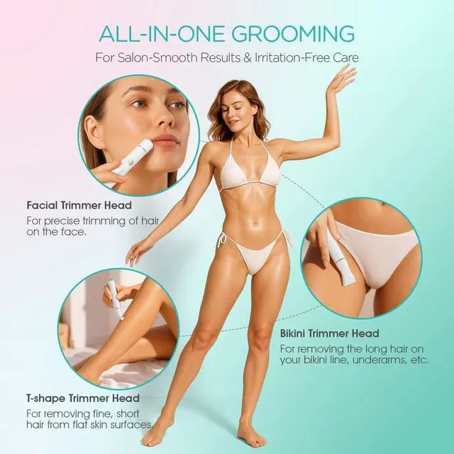 Multi-Functional Trimming: Includes three interchangeable heads for versatile trimming; bikini trimmer for long hair from the arms, underarms, bikini line, legs, and back, precise trimmer head for fine, short hair on flat skin surfaces, and facial trimmer head for trimming hair on the face, upper lip, chin, cheeks, and jawline