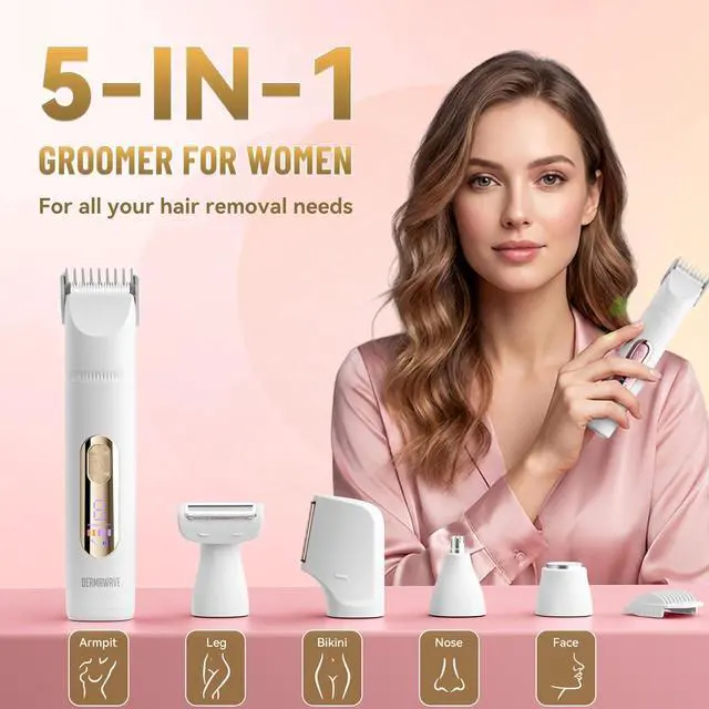 Grooming Kit: Transform your routine with five interchangeable heads, including a high-performance foil shaver, a specialized bikini trimmer, a rotary razor, a body hair trimmer, and precise nose & ear hair trimmers. This comprehensive hair trimmer effectively handles everything from fine peach fuzz to thick pubic hairs.
