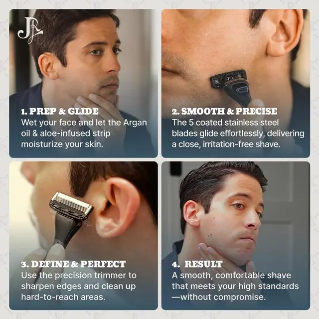 COMPLETE SHAVING KIT FOR MEN: Includes 1 razor with ergonomic handle, 4 five-blade razor cartridges, and precision trimmer for details & edges. It' s your ultimate men' s shaving tool for an ultra-smooth, close shave on your head, face and body