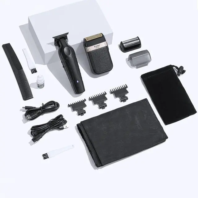 Men: KEMEI 2299 & KEMEI 2024 2-in-1 grooming kit includes 1 hair trimmer for men, 1 foil shaver, 3 guide combs (1 mm, 2 mm and 3 mm), 2 USB charging cables, 1 barber cape and more. KM 2024 electric shaver for men also includes 1 replacement foil mesh. Whether you are trimming your hair, styling your beard, or achieving a close shave, this set ensures professional-quality results at home or on the go