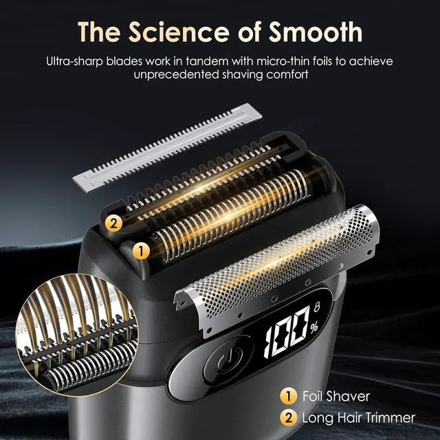 Dual Shaving System (Foil Shaver + Trimmer): The precision foil shaver for men conforms to your facial curves, while the built-in trimmer allows for precise sideburn shaping and beard shaping. The titanium alloy blades with floating technology conform to your facial curves, making them comfortable even for sensitive skin