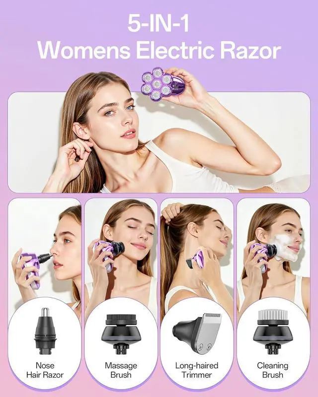 5-in-1 All-in-One Grooming Kit This set of razors for women includes a main electric shaver, hair trimmer, nose hair trimmer, facial cleansing/massage brushes, and 3/5/7mm guide combs. Attachments snap on/off effortlessly, switching from a precise bikini trimmer for women to smoothing legs, underarms, or gentle facial grooming. Elegantly packaged in a luxury box, its perfect for self-care or giftingpracticality meets premium charm.