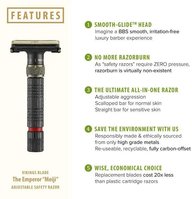 VIKINGS BLADE Adjustable Double Edge Safety Razor + Luxury Case. Smooth, Reusable, Eco-Friendly (The Emperor Meiji)