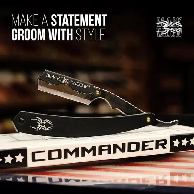Black Widow Professional Barber Straight Edge Razor Stainless Steel Shavette, 1.5 mm Blade Exposure, Matte Black & chrome, 10 Double Edge Blades (20 Single-Edge) for Lineups & Beard Shaping