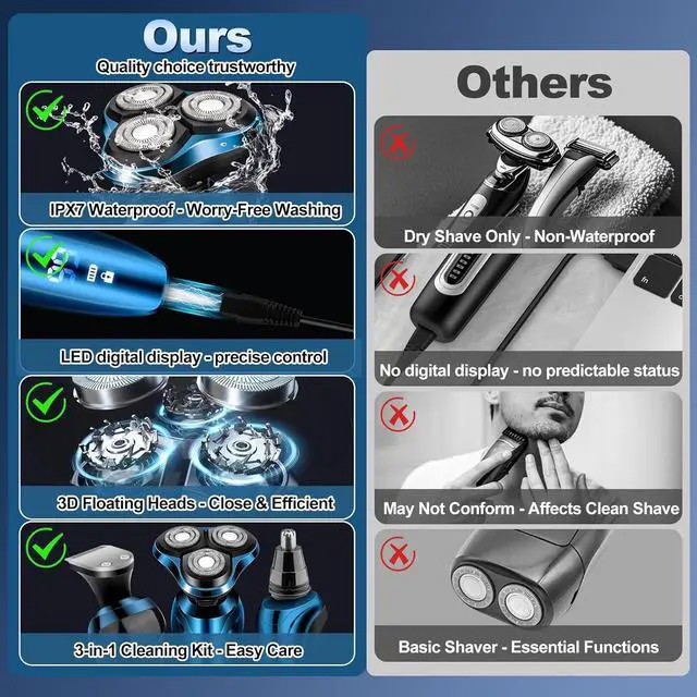 Dry and Wet Shaving & 100% WashableThe IPX7 body of the rechargeable mens shavers is waterproof and you will get a convenient dry shave or a refreshing wet shave with gel or foam for a more comfortable shaving experience even in the shower. The fully washable feature makes the mens electric shaver very easy to clean. After each use, just touch of a button, turn on the shaving heads and rinse with water, and any cut hair in the cabin will be washed away.