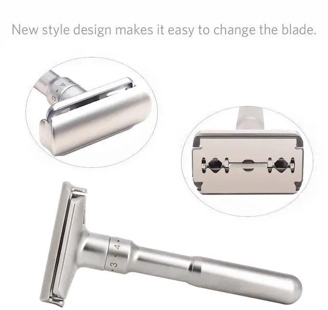 Matte Silver finishing adjustable long handle safety razor to set blade exposure levels from 1 to 6, High quality stand made by aluminum alloy, also matte Silver finish.