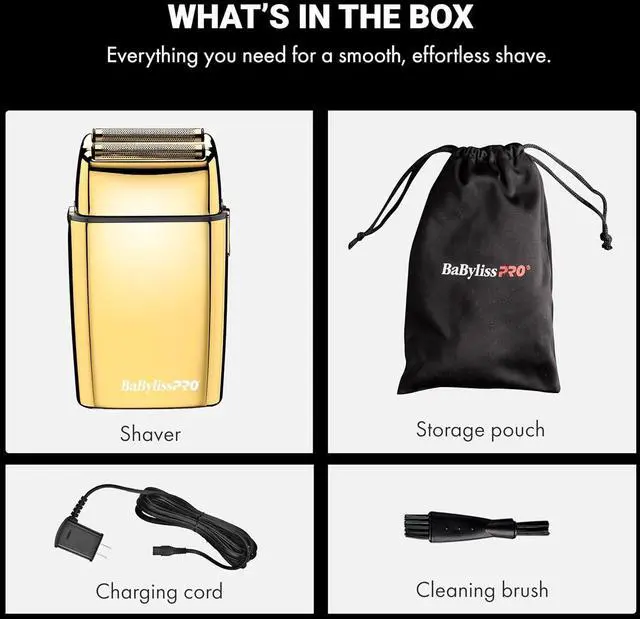 DOUBLE FOIL SHAVER: The BaBylissPRO FOILFX cordless shaver is a professional compact-size metal electric foil shaver with a gold hypoallergenic double-foil system for an extra-close shave. Includes storage pouch, cleaning brush, and charging cord.