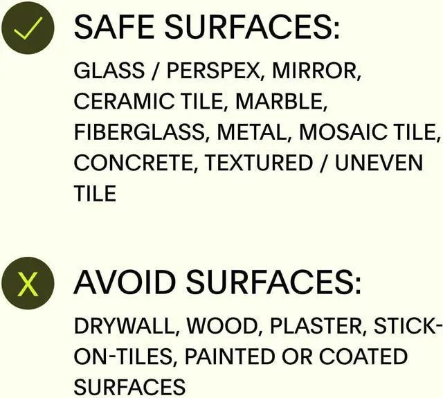 Recommended Surfaces: The Leaf Shower Holder is recommended for use on glass/perspex, mirror, ceramic tile, marble, fiberglass, metal, textured/uneven tiles, mosaic tiles, and concrete. Surfaces including drywall, wood, plaster, stick-on-tiles, and painted surfaces should be handled with care as the adhesive may cause damage them upon removal.