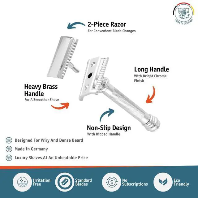 -: The two-piece construction of double edge safety razor ensures reliable blade alignment while simplifying blade changes. This robust design supports long-term durability and maintains consistent shaving characteristics over extended use.