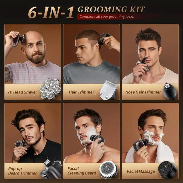 s Grooming Kit: This shaving set comes with five replaceable heads including head shaver, hair/sideburn trimmer, nose hair trimmer, facial massager, and deep-cleansing brush, allowing you to effortlessly switch between tasks for a complete head-to-face grooming routine. The built-in pop-up trimmer offers quick detailing for hard-to-reach areas like sideburns and mustaches and included three guide combs (3/5/7mm) enable fully customizable hair length and styling. All accessories are packed in a premium gift-ready box, making it the thoughtful present for any occasion.