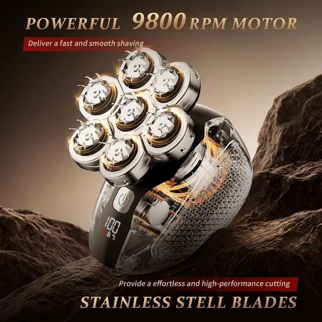Floating Shaving System: Designed with seven independently floating razor heads, this shaver automatically adjusts to every curve of your face, neck, and head, delivering a consistently close yet gentle shave with. Driven by a high-performance 9, 800 RPM motor, it provides strong and stable cutting power to efficiently capture more hair in a single pass, significantly reducing repeated strokes and saving time. Whether youre shaving flat surfaces or tricky contours, each head maintains perfect skin contact for a faster, smoother, and more comfortable shaving experience.