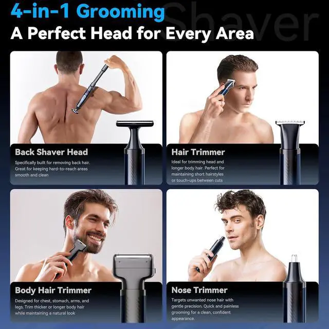 This mens back shaver includes: T-shaped back shaver, precision groin trimmer, nose trimmer, and foil body hair trimmer, covering every grooming need with ease