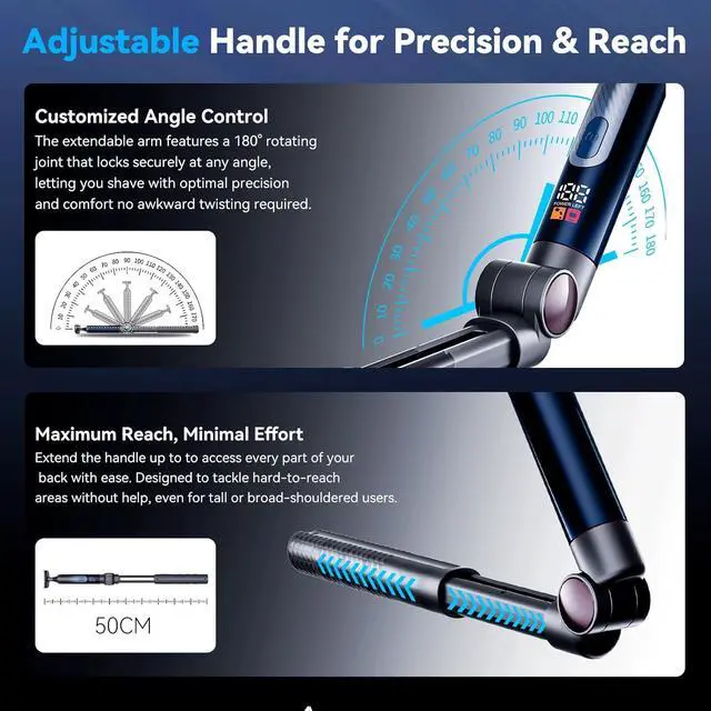 Long Reach & Waterproof: Mens back shaver extends to 50cm & bends 180° for easy reach. IPX7 waterproof electric back shaver is safe for wet or dry use, even in the shower