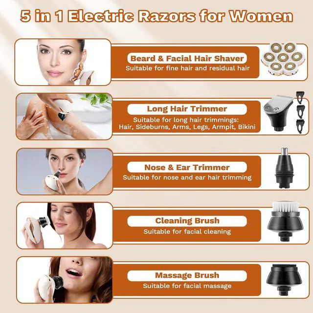 5-in-1 Lady Shaver KitElectric razors for women come with 5 detachable heads and limit combs, suitable for hair on all parts of the body. Up to your hair, face hair, lip hair, nose hair, armpit hair and arm hair, down to your bikini area and legs hair. Whether it is fine hair, peach fuzz, thick hair or stubble, all can be completely removed from any designated area in few minutes without any residue left.