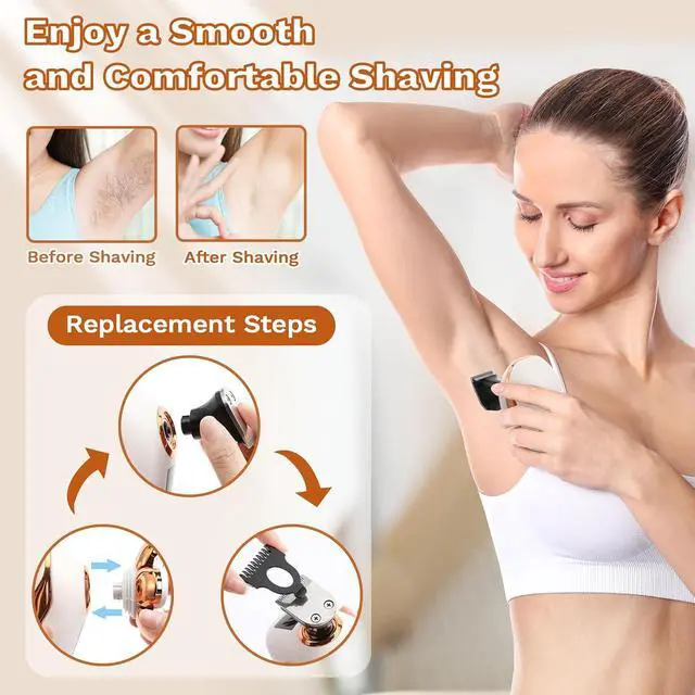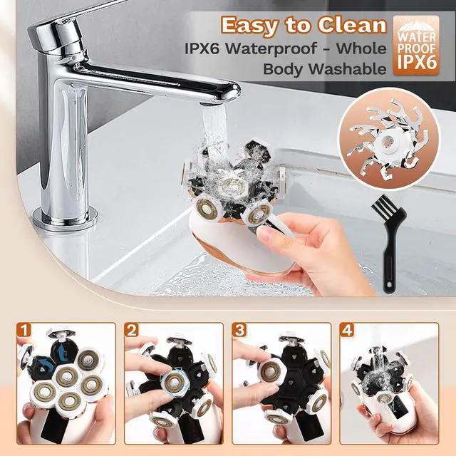 Upgraded 7D Floating BladesCompared with other 5D floating blades, our 7D wrap-around floating blades allow our lady shaver to automatically adapt to the contours of your hands, legs, head, face, neck and even chin. Providing you with a comfortable and efficient shaving experience. Rounded head design is acne-friendly and perfectly protects skin from nicks and cuts. 360°Gentle, painless and clean hair removal.