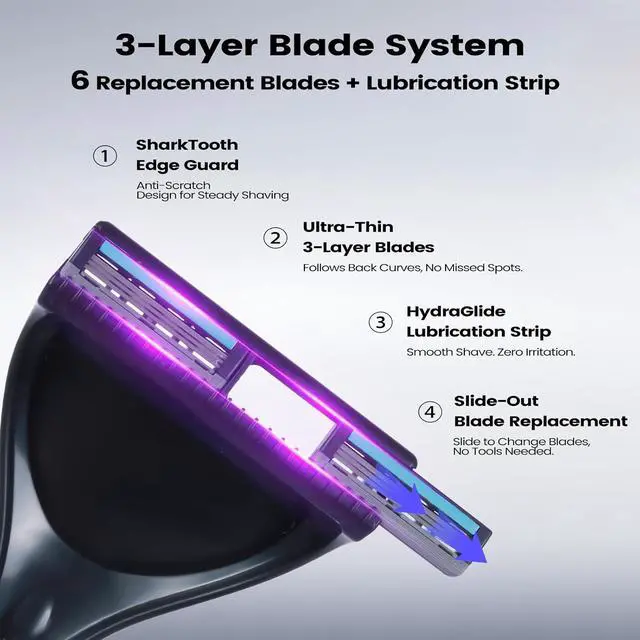 Easy Blade Replacement - The blades are easy to push to the side for changing to keep the men back shaver sharp, and keep the best shaving effect for a long time. Up to 2 months of shaves with each replacement blade. ( Based on 1 full shaves per week. Using our blade is like using most razors, actual