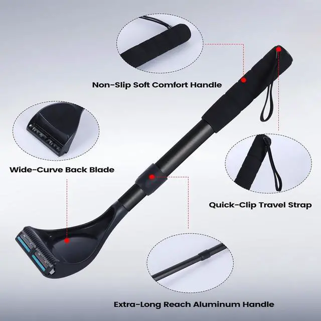 Retractable Long Handle - The back hair shaver for men is up to 21.1 inches in length, and up to 14 inches short for your various usage scenarios, the ergonomic and comfortable handle makes it easy to reach all your hard-to-reach spots. Also, it can be used to shave your back and body both wet or dry