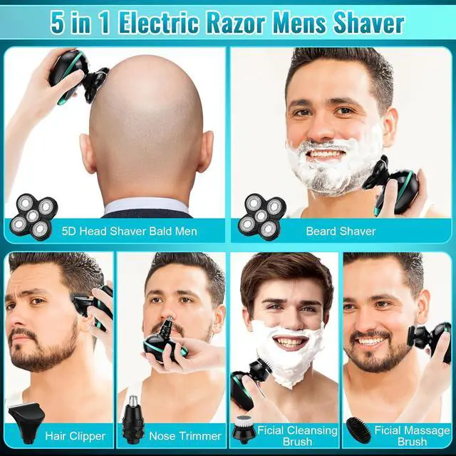 Head Shavers for Bald Men, 5D Electric Razor Dolodomy 5 in 1 Waterproof Display Mens Shaver for Wet Dry Electric Skull Shavers with LED Lights Nose Hair Sideburns Trimmer and Face Cleaning Brush