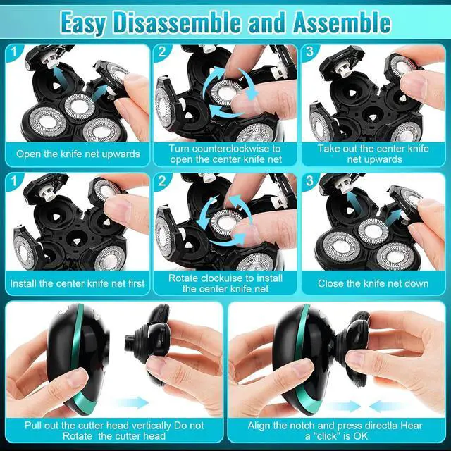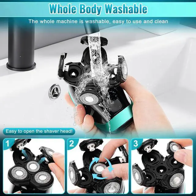 IPX7 WATERPROOF & DRY/WET SHAVINGIPX7 waterproof grade supports full body washing that can be dry or wet shaving use. You can use our men' s electric shavers even in the shower. If you want a cleaner shaving experience, we recommend that you use shaving foam to soften the stubble before using our head shavers. The head shaver has a snap-on opening, simply flip open each razor head and clean the hair with the included brush, or wash the blade directly with water.