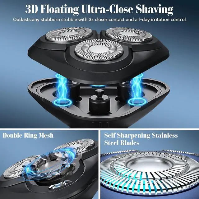 Upgraded Detachable Rotary ShaversMagnetic 3D floating Precision Shaving Head Experience an ultra - close shave with our innovative magnetic shaving head, featuring 3D 360° contour adaptation. It effortlessly conforms to the curves of your face, capturing every single hair for a smooth and clean shave every use