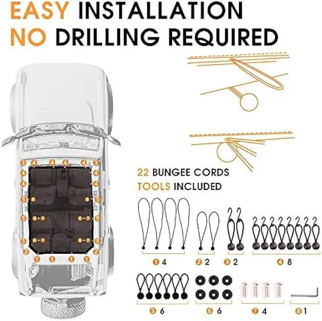 SUNLIGHT UV BLOCKER: Breathable Mesh Bimini Top, can blocks over 90% of sunlight, protecting you, and the interior of your car from UV damage. With the bronco mesh top cover allows you to enjoy the fresh air and avoiding painful sunburns in crazy hot days
