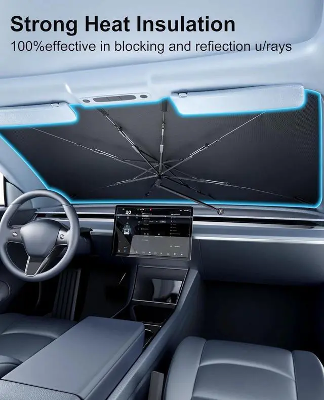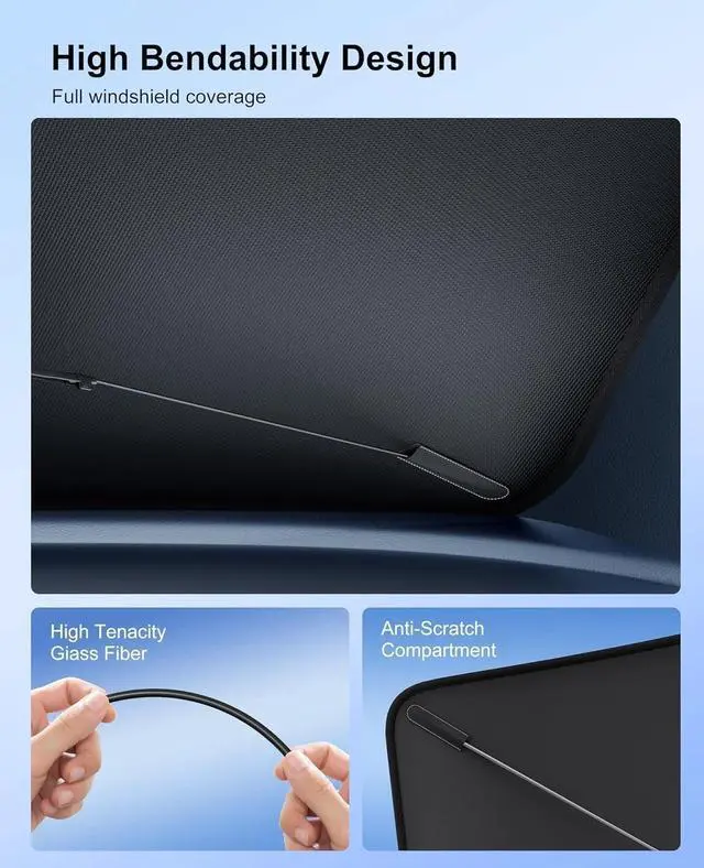 Fiberglass Umbrella Skeletons - 8 strong umbrella skeletons of the windshield sun shade umbrella is made of fiberglass material, and the umbrella skeletons can be bent 90 degrees without breaking and lightweight. The bendable umbrella frame can be adapted to different car of windshields by bending the umbrella skeletons