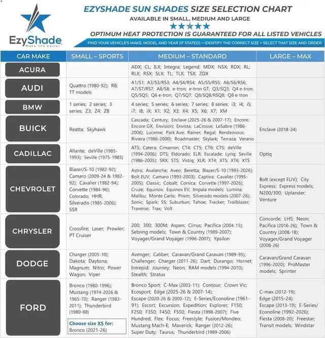 Best Coverage Best Fit: Find your vehicle in the comprehensive Vehicle Size Chart. EzyShade Sunshades are 2 identical rectangular shades allowing for maximum adaptability to your cars windshield. You can install vertically or horizontally to achieve the perfect fit.