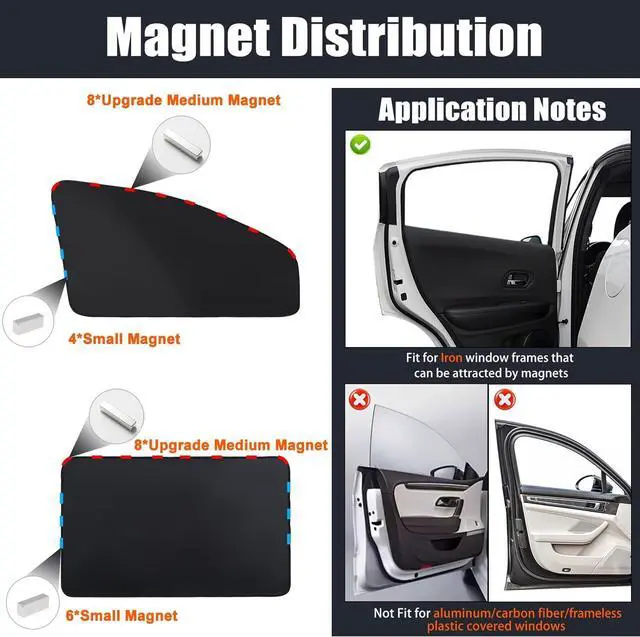 Magnetic Installation: 12 magnets embedded in the front side window sunshade, 14 magnets embedded in the rear side window, in which the top magnets are upgraded to bigger magnets, and the sides are small magnets. Only for iron window frame models that can be attracted by magnets, not for aluminum/plastic covered/rubber wrapped/frameless models. Please confirm your car window frame material before purchase, such as using magnetic refrigerator stickers for testing