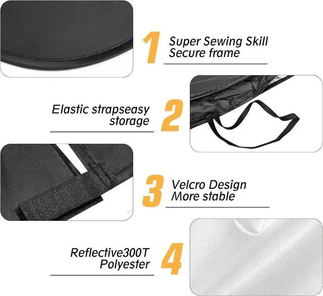 Easy to Install & Foldable to StoreAll you need to do is put the sun shade over the entire windshield, put the visor down and press down, then tighten the Velcro on the sun shade. It' s an easy job. The windshield shield has an elastic memory line, which can be bent and folded into the storage bag, does not take up space, and will not be deformed when used again. You can easily tuck the windshield cover sun shade into your door pocket