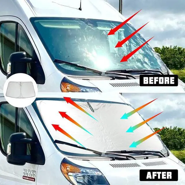 Van Sun Visor Protector: This ram promaster Van sunshade is especially fit the windshield sun visor of 2014 2015 2016 2017 2018 2019 2020 2021 2022 2023 2024 2025 Dodge RAM ProMaster Full Size Cargo Van, Chassis Cab Cutaway Window Van. Sunshade prevents over heat penetration causing damage to your steering wheel, windshield dashboard, interior and your car seat.