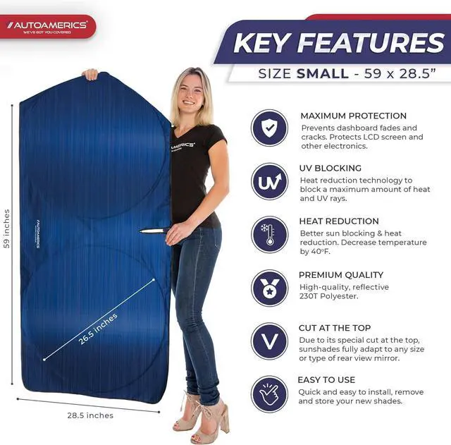 High-quality appearance: Autoamerics Shades are premium quality with improved high-density UV reflective material, reinforced with high-strength ductile wire and the latest heat reduction technology. Our sunshades are among the most innovative and effective sunshade solutions available on the market today!