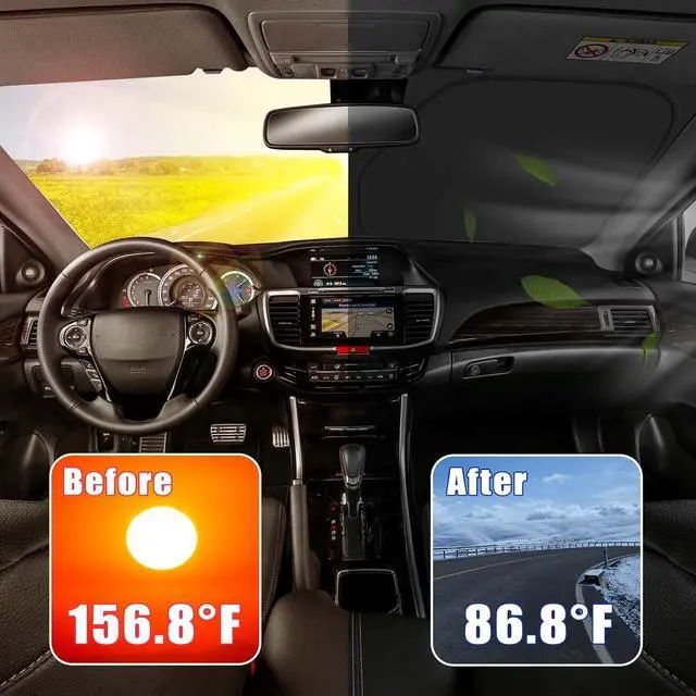 DESIGNED IN USA[Newest Patented Design] - Dashboards and leather upholstery become dry and discolored in summer. The Motomate windshield sun shade is your best bet at blocking heat and UV rays, protecting the interior and keeping the cabin cooler and more comfortable on hot summer days.
