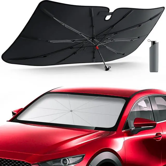 [Universal Compatibility] - Tailored to fit 99% of vehicles, our sunshade comes in two sizes (53" X29", 57" X31" and 61" X33" ) to accommodate various car models. Featuring 6 high-strength and strong-toughness ribs and enhanced with corner springs for added vehicle protection, it' s the ideal blend of performance and versatility. Even if your car is slightly larger, it can still be used normally, making this umbrella car shade fit for most car models and sizes.