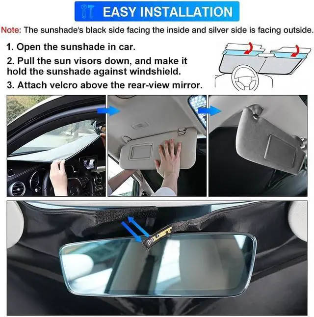 Easy to install and storeInstall and fold in seconds without any suction cups or adhesives. With elastic memory steel wire, never deform, easy to unfold and store. (NOTE: The key to success is to grab the sun shade diagonal and twist like' ' 8' ' )