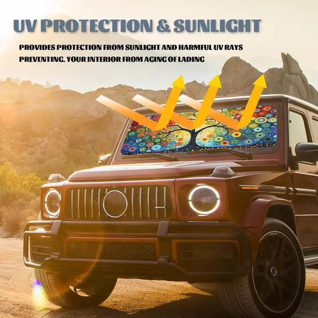 HIGH-QUALITY MATERIALOur Tree of Life car shade front windshield is constructed from high-quality double-insulated laminate. The windshield shade is made of Oxford Cloth that protects you harmful UV rays effectively.