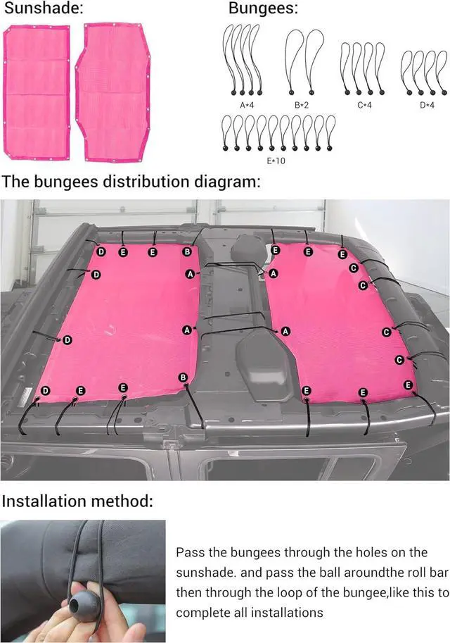 Easy installation requires no tools or vehicle modifications. Includes 24 bungee cords that fasten around the roll bars and attach to the body tube for a snug fit. Installation guide is available on the 7th picture