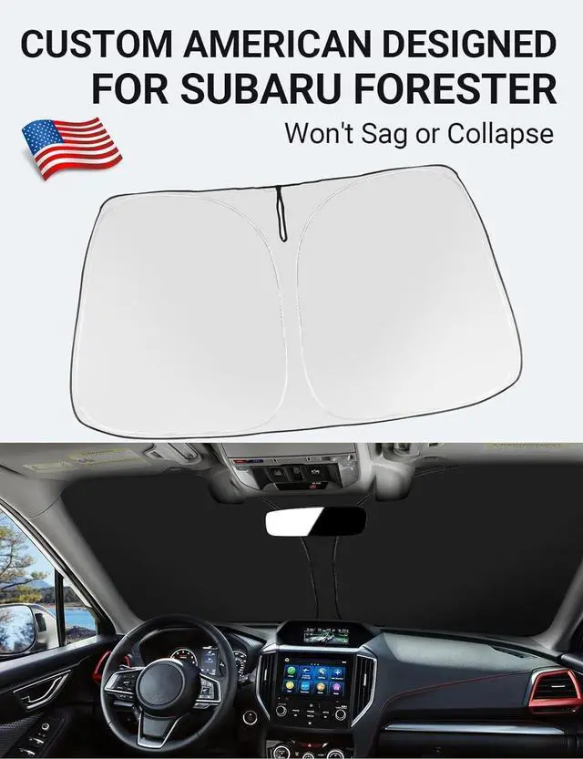 Custom Design: The front windshield shade has been custom cut specifically for Subaru Forester. Precise fit design and Reinforced steel rings make a precise and secure fit to the window, no need to use suction cups to hold it in place. It won' t sag or collapse like other car heat shields. Fits for Subaru Forester 2025 2024 2023 2022 2021 2020 2019.