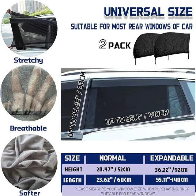 Stretchy Material || 2 Pack Rear Car Window Sunshade, can stretch from ( 23.62 - 55.1 " Width ) to ( 20.47 " - 36.22 " Height). Fit for 96% of cars, SUVS.