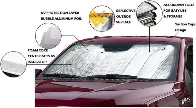 High-level Sun Protection: Protects Your Vehicle from 99% of Harmful UV Rays Damage, keeps car in all solid protection, auto front sun shade maintains pristine Interior without fading or cracking. For driver in summer, sun shade car as good helper to block sunlight, reduce the temperature inside of vehicle before driving.